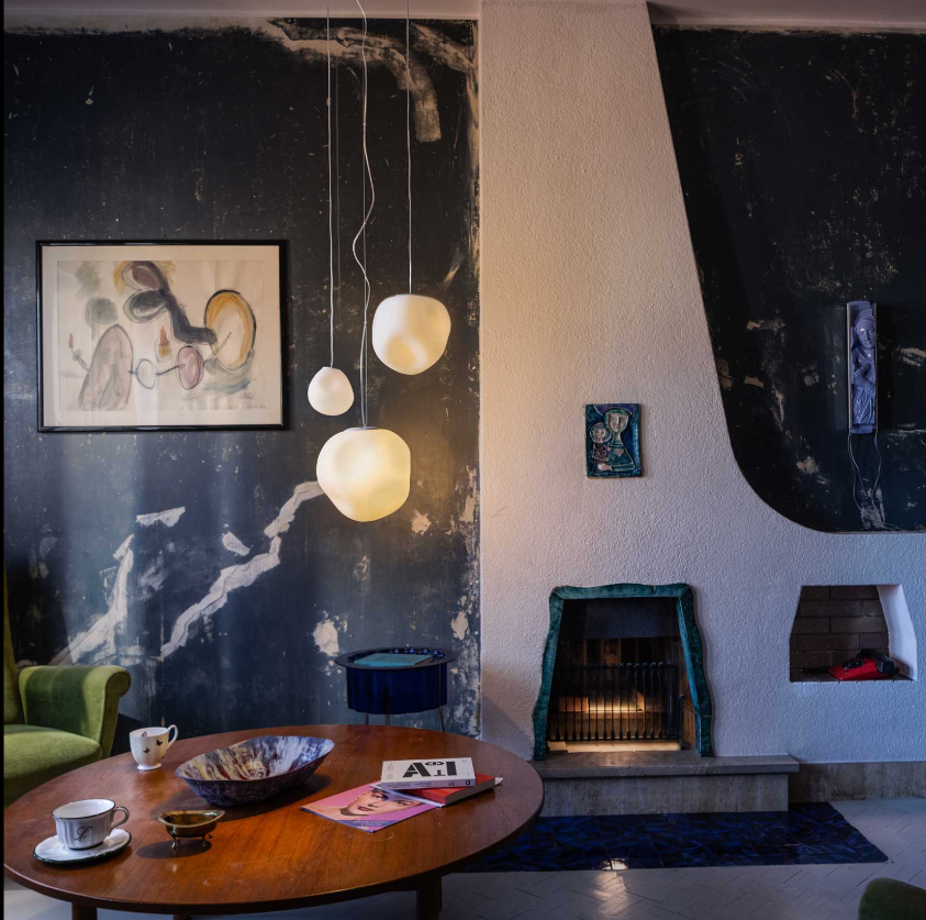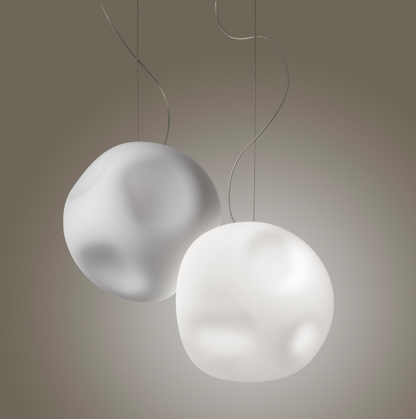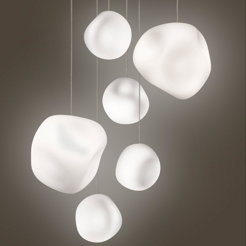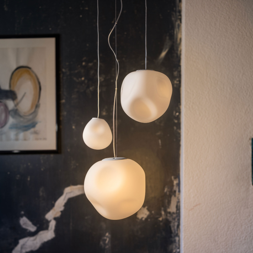 Réalisée en verre soufflé mat caractérisé par des concavités irrégulières, la lampe suspendue Hoba ressemble à une pierre tombée du ciel. Avec sa lumière chaude et enveloppante, elle est parfaite pour éclairer les espaces, seule ou dans des compositions de différentes tailles.