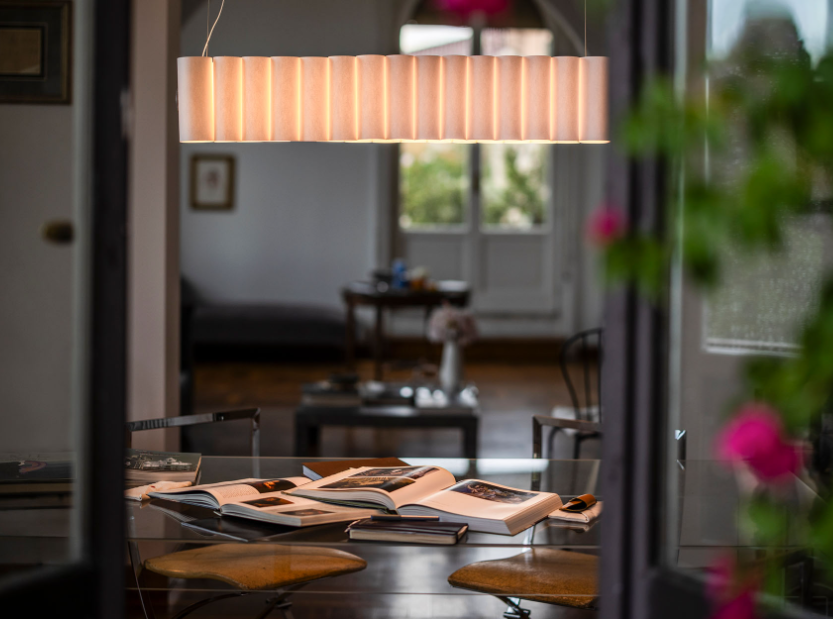Une lampe suspendue qui unit forme, matière et structure en un seul geste. Les plis doux et les drapés de Pli évoquent la légèreté d’un vêtement, tandis que sa lumière diffuse une ambiance chaleureuse et enveloppante dans les intérieurs.
