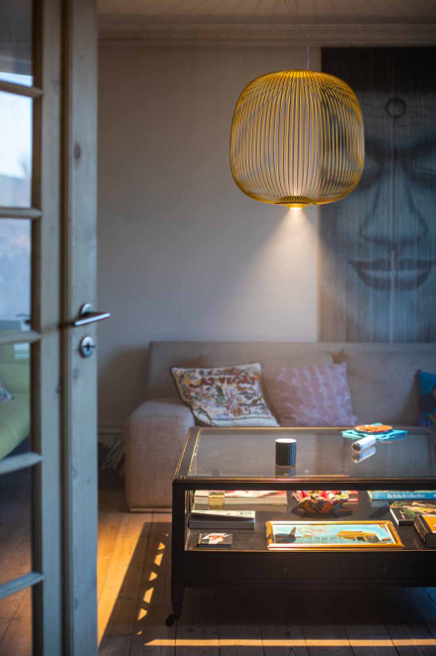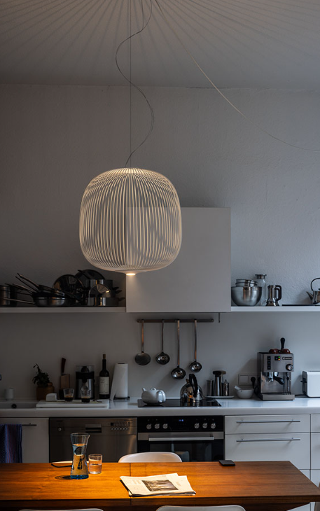 Spokes exprime une sensation de légèreté et de mouvement. Comme à travers une grille géométrique magique, la lumière filtre de l’intérieur, projetant un kaléidoscope de vides et de pleins. La forme de la lampe suspendue Spokes 2 fait penser à une lanterne ou à une volière.