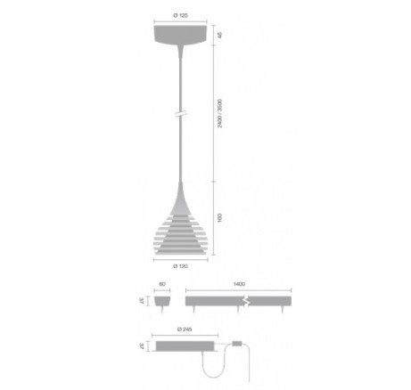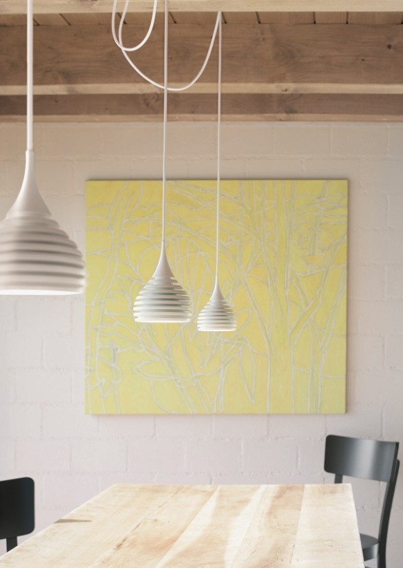 Afin d’offrir un maximum de flexibilité dans l’adaptation aux différentes situations, plusieurs systèmes de fixation au plafond ont été développés, à savoir une rosace simple pour la suspension d’un seul luminaire (réf. 010.1.125), une rosace plus grande pour la suspension de 2 ou 3 luminaires (réf 010.2.240) ainsi qu’un rail d’une longueur de 1400mm (réf. 010.1400) permettant la suspension en ligne de 2 ou 3 luminaires. Une pièce annexe (réf. 010.0.1) permet à partir des rosaces de distribuer librement les luminaires dans l’espace et de créer une composition adaptée à chaque situation spécifique (table longue ou ronde, petite ou grande, desk, etc).