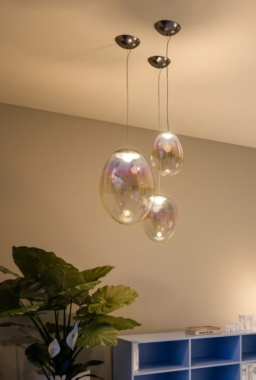Les formes des diffuseurs sont obtenues par soufflage du verre, puis façonnées librement par les maîtres verriers pour les rendre toujours uniques. La connaissance artisanale et l'innovation industrielle se rejoignent dans la beauté du matériau qui met en valeur l'interaction magique entre le verre et la lumière.